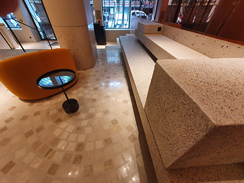 Le projet comporte enfin la création et l’installation de 2 banques d’accueil et de 2 bancs sur mesure en forme de parallélépipèdes, ainsi que 500 m² de parements muraux en terrazzo-granito.